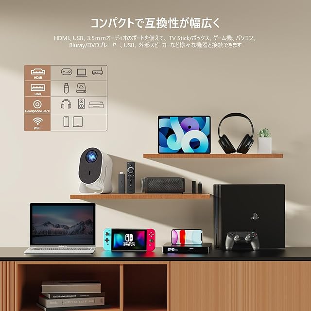 【Wi-Fi6と双方向Bluetooth搭載で安定かつ多彩な接続が可能】NX6家庭用プロジェクターは最新のWi-Fi6技術を内蔵し、2.4GHzと5GHzのデュアルバンド対応で高速かつ安定した通信を実現。動画再生もスムーズに行えます。Bluetooth5.4による双方向接続で、外部スピーカーやイヤホンにワイヤレス接続可能です。HDMIやUSBポートも搭載し、スマートフォン、パソコン、ゲーム機、DVDプレーヤーなど多彩な機器に対応。別途テレビボックスを接続すれば地上波視聴も可能となり、家庭用小型プロジェクターの利便性を高めます。
