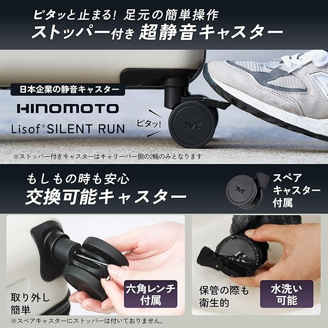 【ワイドキャリーバー×高性能キャスターで、至高の移動性能を実現】専用設計のワイドキャリーバーで、荷物を多く入れてもブレにくく、安定した操作が可能。さらに、HINOMOTOの究極な静音キャスター搭載で、早朝や深夜の移動も快適です。足元で簡単操作できるストッパー機能で、走行中の電車やバスでの移動も安心。キャスターは付属の六角レンチで簡単に交換できるから、万が一のときも心配不要。