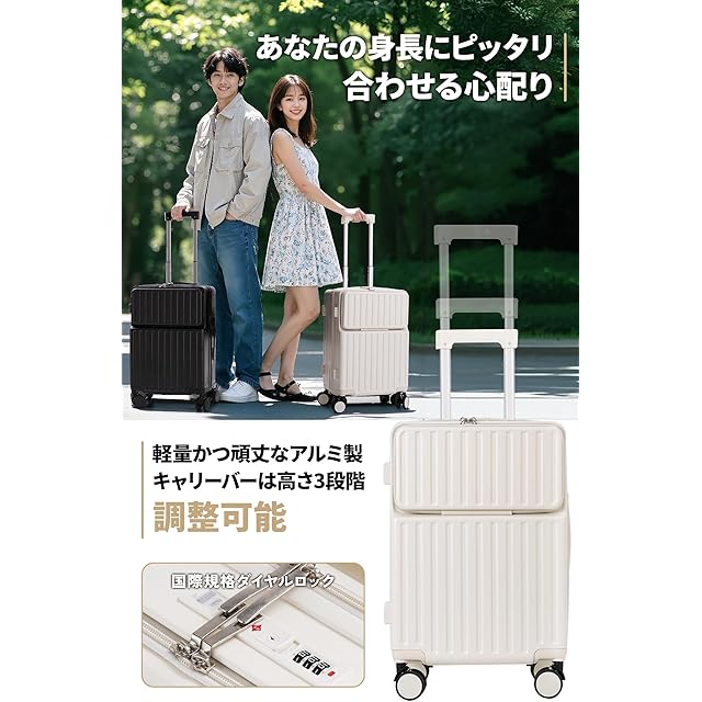 スーツケース 機内持ち込み・多段調節キャリバー・柔軟ハンドル】フロントオープン スーツケースはABS樹脂とPC混合素材を採用されており、軽量で耐圧性、耐久性に優れ、大切なお荷物をしっかりと守ってくれます。三段階調節なスムーズに伸縮でき、さまざまな体格の方に合わせて調整可能です。長旅や出張にも最適です。