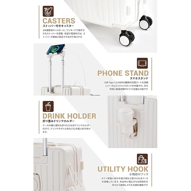 【スーツケース 機内持ち込み・多機能 キャリーケース】①USB充電ポート付き:便利なUSB充電ポート付き、場所を選ばずいつでもどこでも移動しながら効率よく充電ができます。②折りたたみ式カップホルダー付き :便利な折りたたみ式ドリンクホルダー付き。バックカップホルダー、ミルクティーカップ、傘いつでも配置でき、旅行をより便利にすることができます。③隠しフック機能:隠しフックが搭載されており、バッグなどを掛けて、旅行中の手への負担を軽減します。