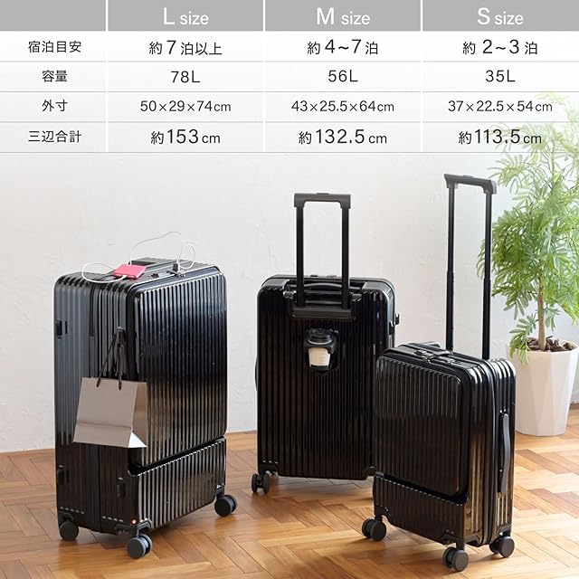 【フロントオープンができるキャリーケース】立てたまま開いて荷物の出し入れができる便利なフロントオープン式のスーツケースです。本体表面は高級感のある光沢仕上げです。