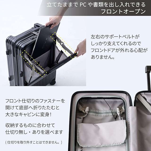 【便利なフロント部分】フロント部分はサポートベルトがしっかりと支えてくれるので、荷物の出し入れ中にフロントドアが外れる心配がありません。スーツケースを立てたままで必要なものを素早く出し入れできます。パソコンや書類の収納に便利なポケットや、中身がすぐに分かるメッシュのポケットが配置されています。フロントの仕切りを開けて奥のキャビンとつなげられるので、よりたくさんの荷物を広い投入口から出し入れすることができます。