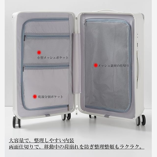 【荷物整理がしやすいダブル仕切り内装】密閉されたU字型コンパートメントは荷崩れ防止だけでなくプライバシー保護効果もあります。メッシュポケットにより、収納しにくい小物でも一目でわかります。乾湿分離対応のポケットを備え、衣類や洗面用品、小物類まですっきりと分類収納が可能です。 見やすく、取り出しやすい設計で、旅先でも整理整頓が簡単に。