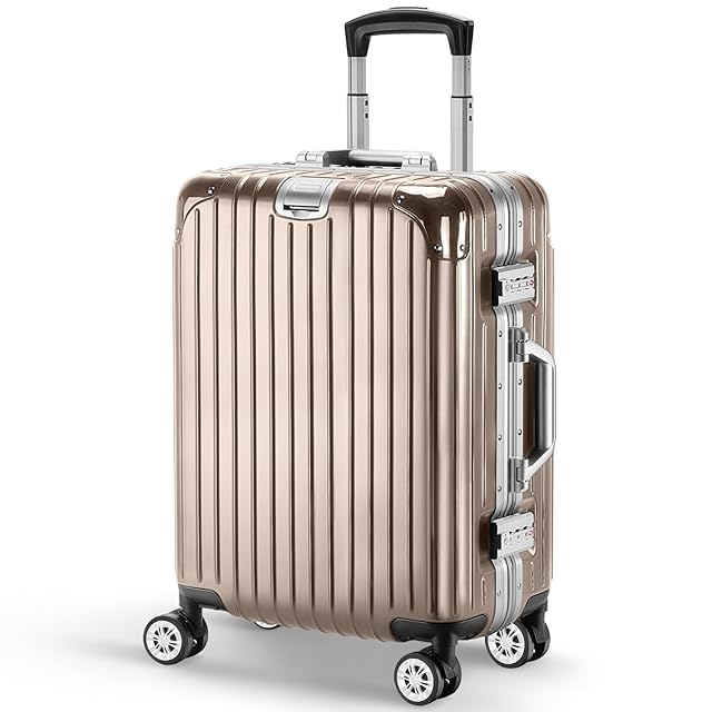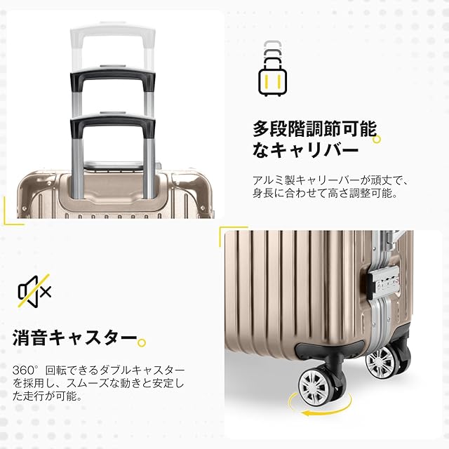 [VARNIC] スーツケース アルミフレーム 多機能 キャリーバッグ 機内持ち込み 超軽量 キャリーケース 大容量 乾湿分離ポケットつき 静音 ダブルキャスター 耐衝撃 保護コーナーパッド付き 360度回転 TSAローク搭載 旅行 ビジネス 出張 学生用キャリーケース (ゴールド, S サイズ/機内持込/38.5L(1~3泊))