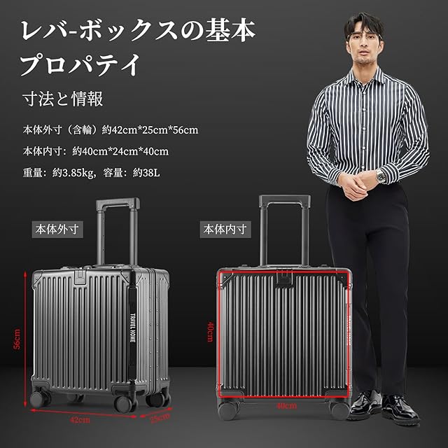 【素材】キャリーケースの材質は オールアルミ合金ボディ+アルミフレーム。特にアルミボディが洗練されたイメージでcool。メタル素材ゆえに強度は折り紙付き。長持ちできます。メタリックボディでルックスも美しく、見た目の高質感があるのもいいところ。コーナーにもプロテクターがつきまして、衝撃に防ぎます。