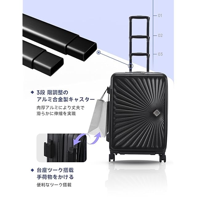 [VIVICITY]スーツケース フロントオープン キャリーケース 機内持ち込み 拡張機能付き ストッパー付き キャリーバッグ 軽量 耐衝撃 大型 静音 360度回転 ダブルキャスター TSAロック ファスナータイプ 旅行 出張 入院(Sサイズ、1泊2日、機内持込、ブラック)