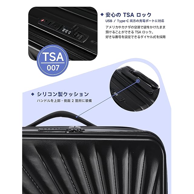 【国際セキュリティ認証TSAロック&物掛けフック】TSA承認ダイヤルロックを装備し、空港検査時の強制開封リスクを解消。二重構造ファスナーが不正侵入をブロックし、貴重品を厳重ガード。鍵紛失の心配ないダイヤル式で、グアムやハワイなど米国圏旅行に必須のセキュリティを実現。【次世代充電システム】Sサイズ/ Typec-C/USBデュアルポートを内蔵。スマートデバイスの充電切れを解消するモバイル充電ステーションとして活用可能。ご注意:Mサイズ、Lサイズは通常預け手荷物用のため、充電機能は搭載されておりません。