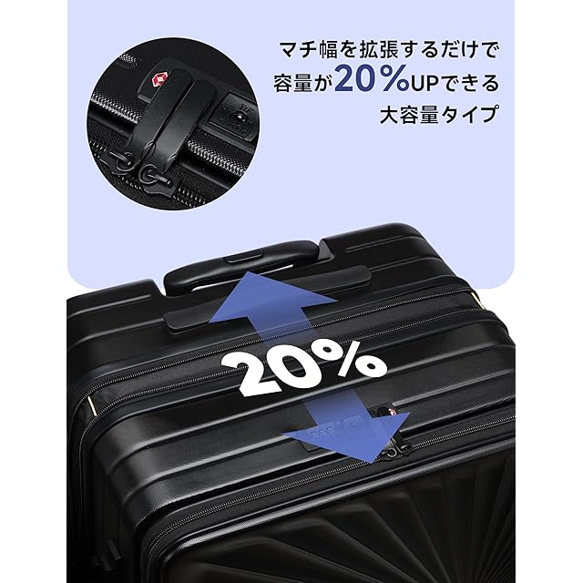 【超軽量設計&拡張機能付き】78Lまで拡張可能な収納空間を備えながら、本体重量は業界トップクラスの3.5kgを実現。女性でも片手で軽々持ち運べる設計で、空港ラウンジやホテルの狭い通路でも安定自立。フロントクイックポケットなら、パソコン(最大15.6インチ対応)やタブレット、書籍などをスーツケースを倒さず即座に取り出せます。多機能仕切りポケットは小物整理に最適で、メインコンパートメントと直結するスマートアクセス構造で、移動中の急な荷物出し入れもスムーズ。【サイズ】Mサイズ(約):65×41×28cm