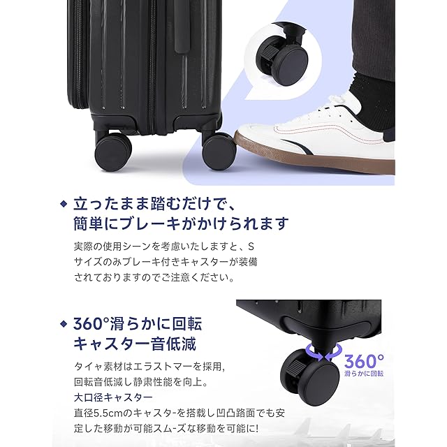【快適移動ソリューション&ストッパー付き】航空機用ベアリングを採用した360°静音キャスターが、石畳道でも滑らかに走行。アルミ合金多段ハンドルは身長に合わせ3段階調節可能。サイドフック付きデザインで、移動中に増えるショッピングバッグの一時収納にも便利。独自の消音技術で従来比30%-50%の騒音低減を達成。また、ストッパーが付いているため、坂道や電車内などスーツケースを止めたい時に便利です。ご注意:Mサイズ・Lサイズは預け手荷物として使用されるため、ストッパー機能を搭載しておりません。