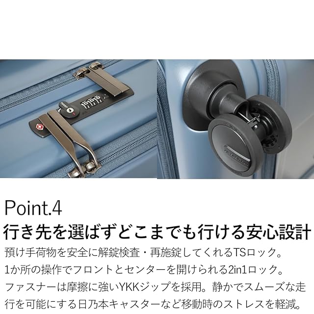 【静音キャスター&キャスターストッパー】走行時の騒音を抑える「Lisof SILENT RUNキャスター」を採用。また、日乃本錠前社製のキャスターストッパーで電車内や坂道などでスーツケースが動いてしまうことを防ぎます。