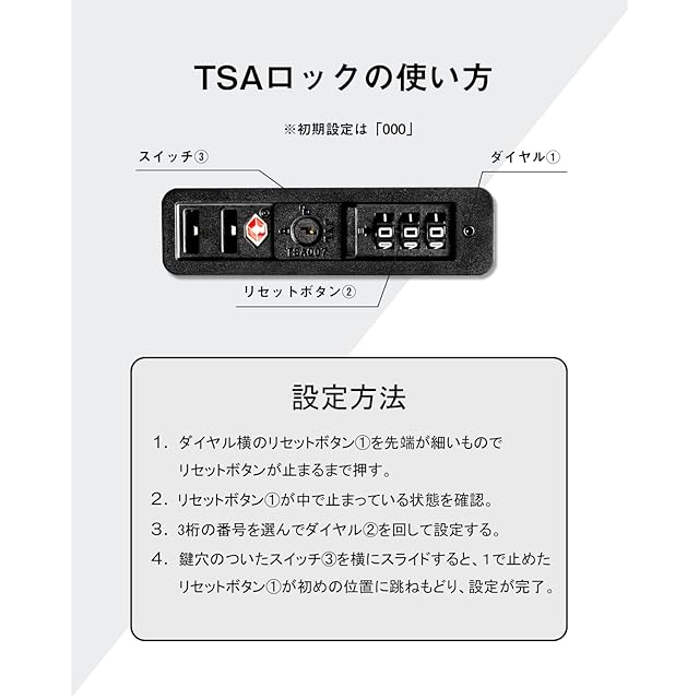 【合理的な仕切りデザイン&安心のTSAロック】密閉されたU字型コンパートメントのおかげで、荷物を入れてもばらばらになりません。メッシュ状のポケット付きで、入れた物が一目でわかります。固定バンドを装備し、荷物崩れを防止します。また、世界基準のTSAロック搭載しています。アメリカ空港(グアム・ハワイ・サイパン含む)では必需品です。ダイヤル式ロックなので鍵を無くす心配がないのも魅力です。