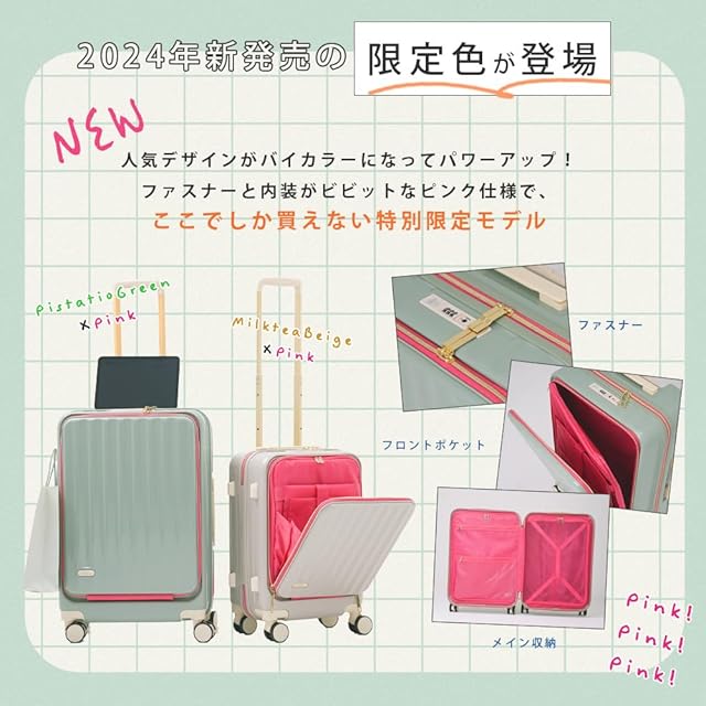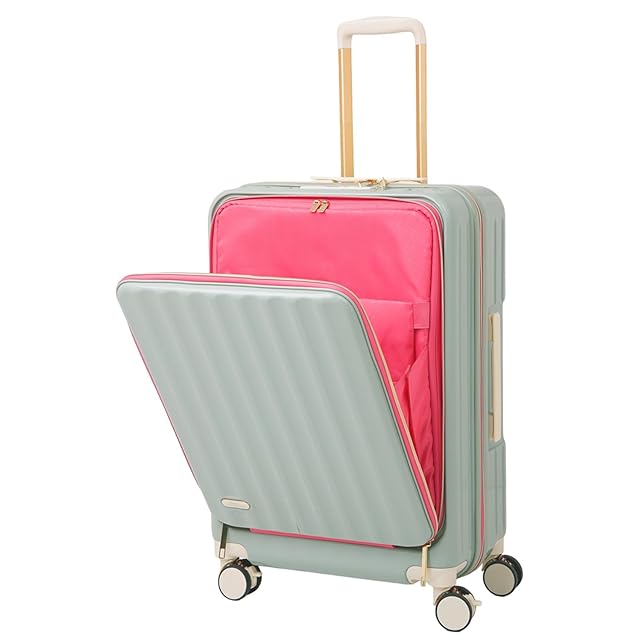 [F FANCY WONDERLAND EST.2011] 期間限定カラー キャリーケース mサイズ ストッパー付き フロントオープン スーツケース キャリーバッグ 4泊5日 中型 軽量 可愛い おしゃれ 大容量 USBポート付き ドリンクホルダー TSAロック 前開き 修学旅行 人気 トランク 女子旅 TY2309 グリーン ピンク 緑 ゴールド (ピスタチオグリーン×ピンク, Mサイズ)