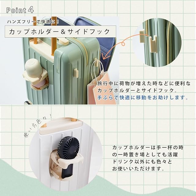 【多機能でおしゃれ】パステルカラーのやさしい色合いがキュートで、高級感のある発色が特徴です。移動中でも充電が可能なUSBポート(Type-A/Type-C)が搭載されており、ダブルキャスターにはワンタッチ式のブレーキ機能も備わっています。さらに、ドリンクホルダー付きで飲み物を持ち運ぶのが簡単です。側面にはフックが付いており、旅行や出張時に荷物が増える悩みを解消します。