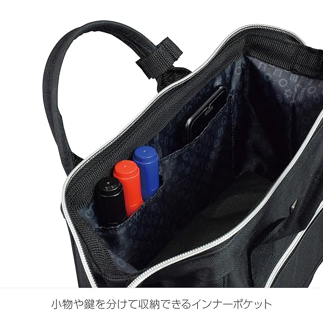 バッグ内側には小物や鍵を分けて収納できるインナーポケットがあります。バッグ両側のサイドポケットには、500mlのペットボトル・スマートフォン・ペンなどの小物を収納できます。
