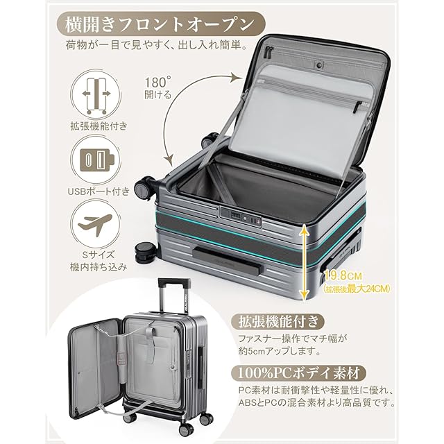 [New Trip] スーツケース キャリーケース フロントオーポン 片開き PC100% 拡張機能付き 機内持ち込み キャリーバッグ USBポート付き ストッパー付き スマホスタンド 隠しフック 軽量 大型 S/M/Lサイズ 耐衝撃 ファスナータイプ 静音ダブルキャスター TSAロック 海外 旅行 ビジネス 出張 (ガンブラック、Sサイズ/機内持ち込み/1~3泊)