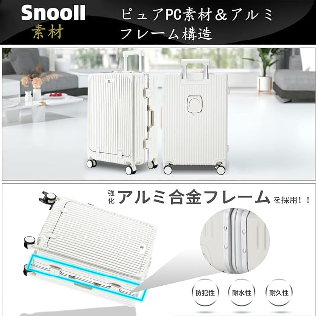 [SnooII] スーツケース 機内持ち込み 多機能フロントオープン キャリーケース ストッパー付き 携帯スタンド USBポート付き カップホルダー付き 隠しフック機能 超軽量 耐衝撃 静音 360度回転 ダブルキャスター アルミフレーム ピュアPC材質 大容量 TSAロック搭載 旅行 ビジネス 出張 (スノーホワイト, Lサイズ /97L (7泊~長期旅行))