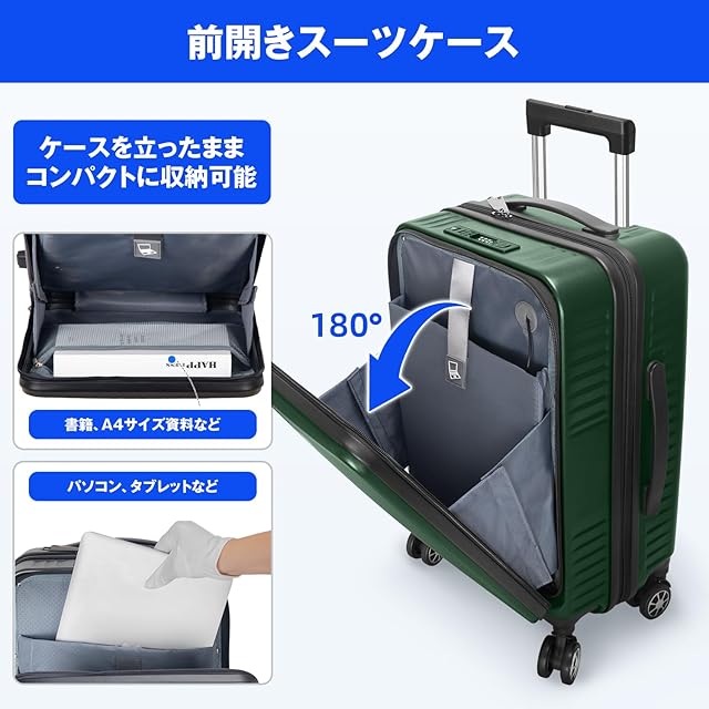[VARNIC] スーツケース フロントオープン 多機能キャリーケース 超軽量 耐衝撃 前開き キャリーバッグ USBポート付き TSAダイヤル式ロック 360度回転 ダブルキャスター 振動軽減 軽量 旅行 ビジネス 出張 (グリーン, Sサイズ/機内持込(1-3泊))