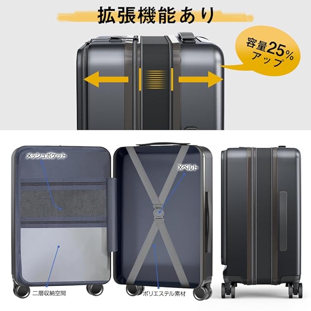 ✅【スーツケース フロントオープン構造|機内や移動中でも出し入れスムーズ】 ノートPCやタブレット、小物類を素早く取り出せるスーツケース フロントオープン設計。特に出張や空港でのセキュリティチェック時に便利です。Sサイズのスーツケース 拡張機能付きは、拡張せずに使えば機内持ち込み可能なため、国内外問わず移動時に役立ちます。スマートで機能的なキャリーケースをお探しの方におすすめです。