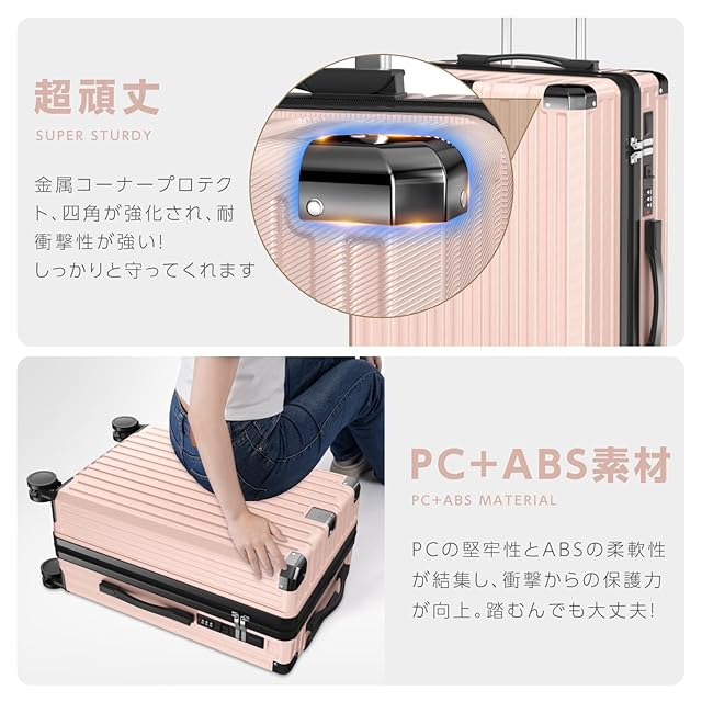 【耐衝撃・丈夫かつ軽いPC素材&ABS素材】表面素材は高耐衝撃性を持つPC(ポリカーボネート)+ABSを100%使用。樹脂は耐衝撃性・断熱材に優れる、ABS樹脂は軽くて弾力性と割れに強く高弾性で、変形しにくい。市販品より頑丈で耐久性に優れ、より軽量で持ち運びやすい。金属コーナープロテクト付きで、本体の四角が強化され、耐衝撃性が強い!しっかりと守ってくれます!