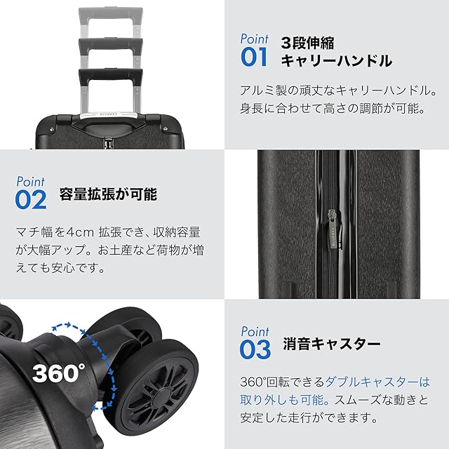 日本製の容量拡張機能付のスーツケースです。ファスナーを開け拡張するだけで容量増量可能です。お土産やなどで荷物が増える場合でも、ゆとりが持てるのでおすすめです。さらに視認性の高いメッシュポケット内蔵で、どこに何を入れたかがひと目でわかり、取り出し作業もスムーズ。大容量で収納便利、初心者から旅慣れた方まで幅広くご利用頂けるスーツケースです。※Sサイズ拡張時は機内持ち込み不可。