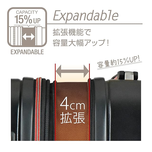 特徴:フロントオープンポケット、HINOMOTO超静音ダブルキャスター採用。ワンタッチストッパー機能搭載、容量拡張機能