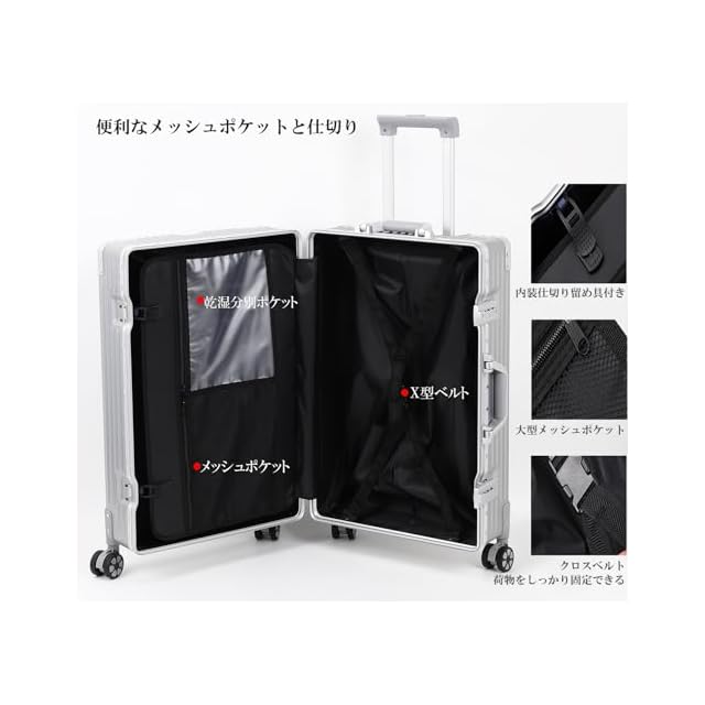 【合理的な収納仕切りで整理整頓も簡単】留め具で仕切り板をフレームにしっかりと固定することで、移動中にズレにくく、荷物を入れても物が散乱せず、整理整頓が簡単です。メッシュポケットも付いており、収納物がひと目でわかります。また、後シェルにはクロスベルトが装備されており、荷物が崩れるのを防ぎます。 ※2025年6月末より、一部の銀色のスーツケースにつきましては、内装が両面仕切り仕様へと変更されております(商品画像にてご確認いただけます)。 現在は両面仕切り仕様と片面仕様が混在しており、いずれかをランダムに出荷しております。仕様のご指定には対応いたしかねますので、あらかじめご了承ください。