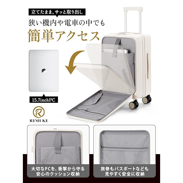 【スーツケース 機内持ち込み・フロントオープン&USB充電ポート付き】立てたまま荷物の出し入れができる便利なフロントオープンスーツケースです。15.6インチまでパソコンやタブレット、パスポートなど荷物に合わせた細かなポケットがあり、旅の途中でも、前ポケットから出したいものを簡単に取り出すことができ、子連れの方やビジネスシーンでも活躍しています。便利なUSB充電ポート付き、場所を選ばずいつでもどこでも移動しながら効率よく充電ができます。