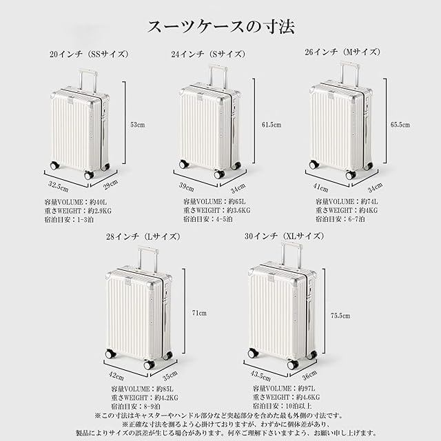 【サイズ】 SSサイズ:32.5×29×53cm(重量約2.9kg、容量約40L、1~3泊対応); Sサイズ:34×39×61.5cm(重量約3.6kg、容量約65L、4~5泊対応); Mサイズ:34×41×65.5cm(重量約4.0kg、容量約74L、6~7泊対応); Lサイズ:35×42×71cm(重量約4.2kg、容量約85L、8~10泊対応); XLサイズ:36×43.5×75.5cm(重量約4.6kg、容量約97L、10泊以上対応) ※寸法はキャスターやハンドルなどの突起部分を含めた外寸です。 ※サイズには若干の誤差がある場合がありますので、ご了承ください。