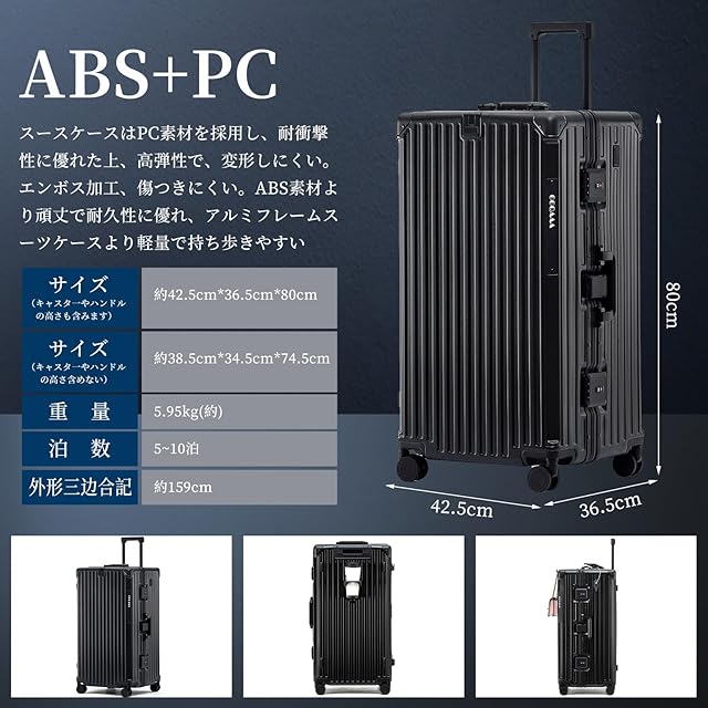 【材質&TSAダイヤル式ロック】スースケースはPC素材を採用し、耐衝撃性に優れた上、高弾性で、変形しにくい。エンボス加工、傷つきにくい。ABS素材より頑丈で耐久性に優れ、アルミフレームスーツケースより軽量で持ち歩きやすい。TSAダイヤル式ロックが搭載されて、外出がより安全。また、鍵穴は航空会社検査専用の物です。本製品に鍵は付属しておりません。