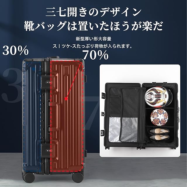 【革新的な3:7の型で スーツケース】収納スペースが、展開すると半分個づつの大きさのキャリーケースと違い、革新的な3:7の型で、深めの半分、ヘルメットや小型炊飯器、靴など、通常のスーツケースには入らない荷物も立てて入れられて、 もう片方に細かいモノを入れたりと、スッキリと収納が出来ます。