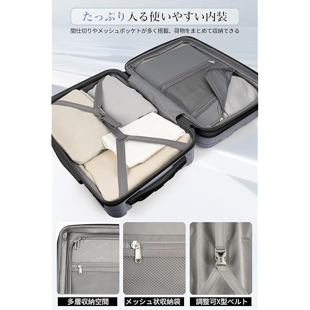 【合理的な仕切りデザイン&安心のTSAロック】スーツケース内部には柔らかく肌触りの良いポリエステル生地を使用し、密閉されたU字型コンパートメントが荷物を整理し、荷崩れを防止しながらプライバシーも保護します。さらに、メッシュ状のポケットにより、入れ物が一目でわかります。X型ベルトの搭載により、荷物崩れを完全に防止します。また、世界基準のTSAロックが装備されており、アメリカ空港での利用にも安心です。ダイヤル式ロックなので、鍵をなくす心配もありません。