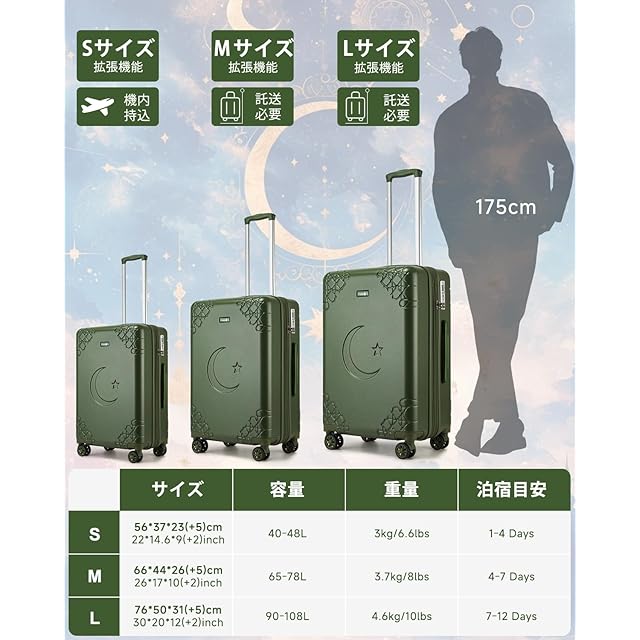 【5間年/サイズ】5年間の国際を提供。21カ国でが適用され、万が一の際も海外で安心です。東南アジアに22店舗以上ある直営店舗で、緊急時の修理や相談が可能(条件適用)。現地でのトラブルも心配ありません。Sサイズ:56x37x23cm/拡張時+5cm、重さ:3kg、容量:40-48L、1~4泊対応。Mサイズ:66x44x26cm/拡張時+5cm、重さ:3.7kg、容量:65-75L、4~7泊対応。Lサイズ:76x50x31cm/拡張時+5cm、重さ:4.6kg、容量:90-108L、7~12泊対応。