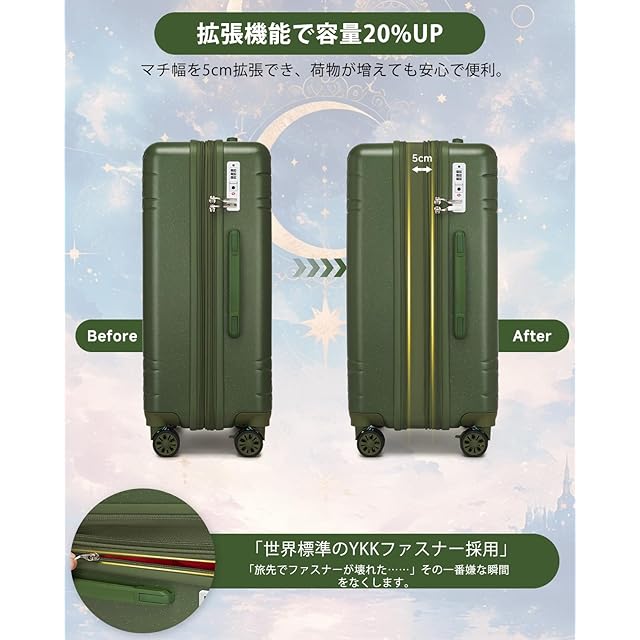 【機内持ち込み可能/拡張設計】Sサイズの機内持ち込み可能なスーツケースを含む、全3サイズに拡張を付き。すべてYKK高品質ファスナーで耐久性と滑らかな開閉を。旅行・出張の必需品!拡張機能付きキャリーケースを使えば、帰りのお土産が増えても、ジッパーを開くだけで本体が最大+20%膨らみ、容量を簡単に増やせます。