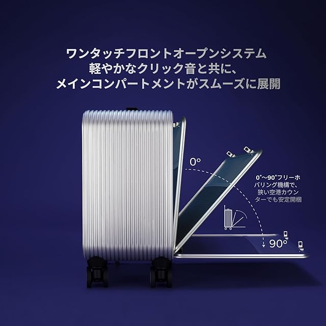 【フロントオープンシステム】航空宇宙グレードのスプリングヒンジと磁気吸着デュアルモジュールを採用。0°~90°の無段階角度調節が可能で、片手で精密な開閉操作が完了。新幹線の中でも、旅の途中でも、こちらの スーツケース はフロントポケットから出したいものを簡単に取り出すことができ、ビジネスシーンにも活躍しています。