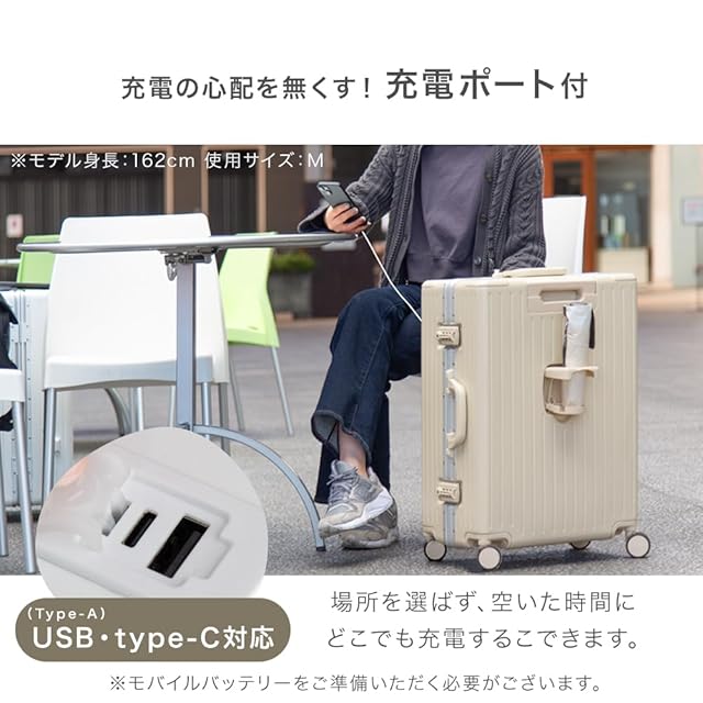 ※2024年8月21日よりSサイズ:アイスグリーン、8月23日よりSサイズ:エクルベージュ、Mサイズ:ジェットブラック、8月30日よりSサイズ:ジェットブラック、9月11日よりMサイズ:ホワイト、9月17日よりMサイズ:エクルベージュ、9月20日よりMサイズ:アイスグリーン、11月1日よりSサイズ:ホワイトのキャリーケース内部防水収納の仕様が変更となりました。 ※本体内type-Aケーブルはiphone15以降のApple製品に対応しておりません。 ※本体内type-Cケーブルを使用する場合は、type-Cポートに接続してください。 ※寸法はキャスター・ハンドル・台座込みの外寸表記になります。測り方や荷物の詰め具合により多少の誤差が生じる場合がございます。あらかじめご了承ください。