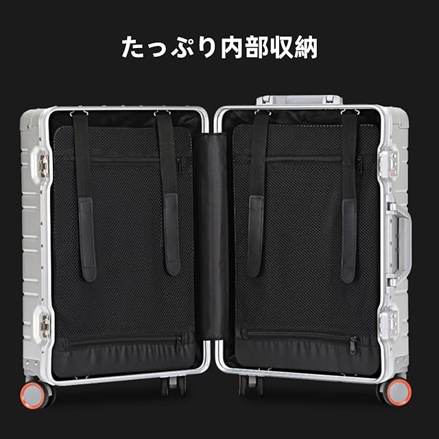 【オールアルミ合金コーナー&収納力抜群】コーナー部分は厚めのアルミ合金板を採用し、四隅が丸みを帯びているので、衝突の心配なくスーツケース本体を効果的に保護します。小さなアイテムでもメッシュポケットで一目瞭然です。このスーツケースは収納力が抜群で、たくさんの荷物を収納できます。
