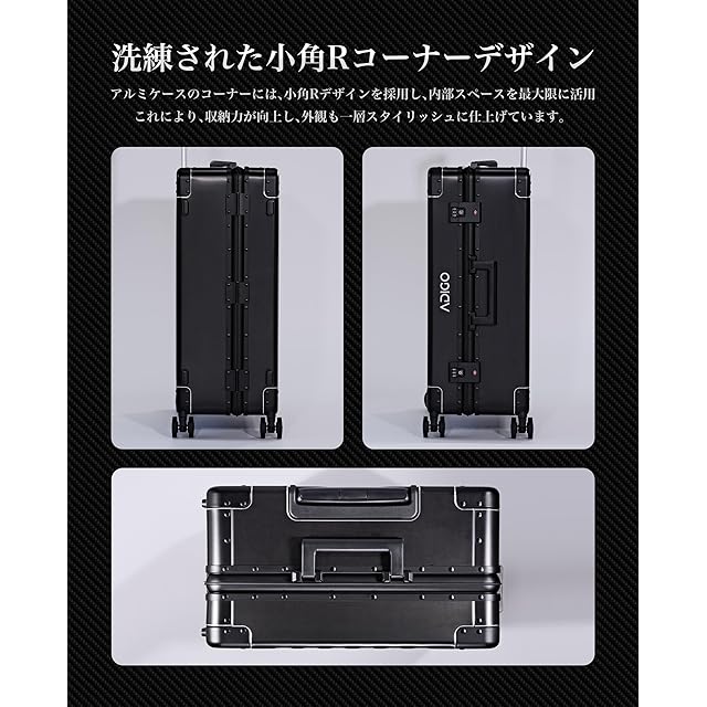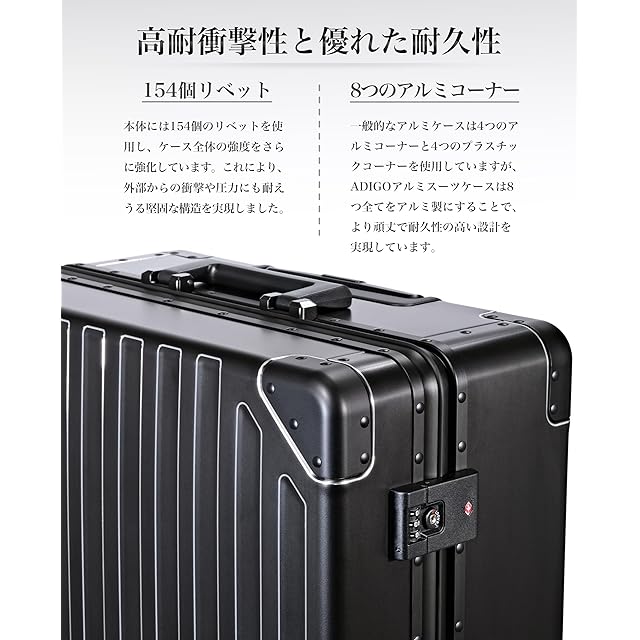 【フルアルミボディ・より厚いコーナーパッド】ADIGOスーツケースはアルミニウムを採用した造りで、傷がつきにくく、衝撃にも強い。 硬度はスチールと同じですが、スチールより数倍軽く、わずかな3.9kg!なめらかな本体のデザイがお気に入りのステッカーを自由に貼り付けられます。 移動中にスーツケースをぶつけて傷つけてしまう、そんな不慮な破損を防ぐために、同じアルミニウム合金素材のコーナーパッドを8つ搭載し、本体の頑強さがさらにアップし、コーナーからしっかりと守ります。