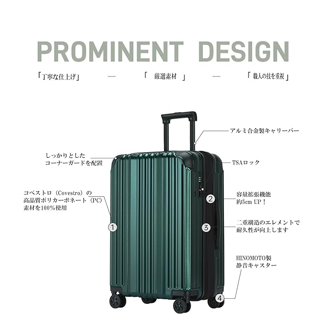 【ポリカーボネート製ボディ&使いやすい内装】 ドイツメーカー製の高品質ポリカーボネート(PC)素材を使用。ABSやPP素材に比べ、耐衝撃性は約2倍で、耐熱性・耐寒性にも優れています。そのため、長期間使用しても経年劣化や変形、割れが起こりにくいのが特長です。表面はキズや汚れが目立ちにくいエンボス加工を施しており、旅行や出張でも安心して使用できます。 内装は肌触りの良い素材を使用しており、全体が快適です。整理整頓しやすい両面仕切り構造で、片面には仕切りの下にクロスベルトを配置しており、通常の仕切りだけの場合よりも衣類をしっかり固定し、ズレや型崩れを防ぎます。もう片面には、小型ポケット、乾湿分別ポケットを備え、旅行中の収納をスマートにサポートします。
