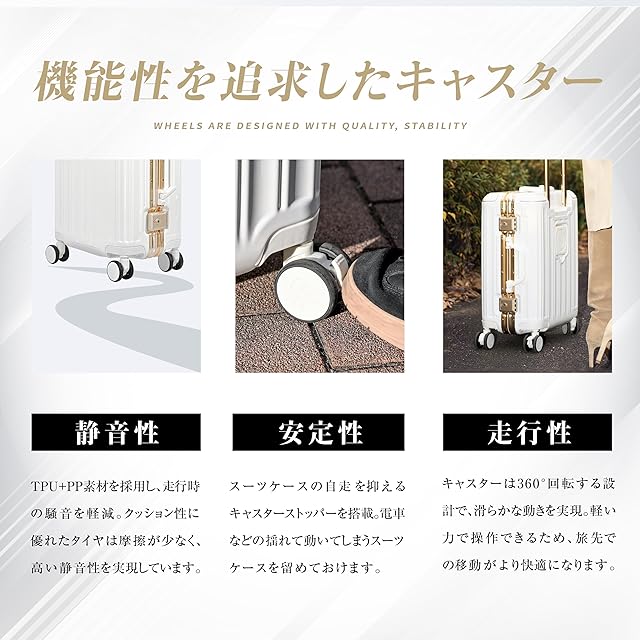 【360度静音キャスターと隠れたフック】高弾性のTPE素材のキャスターで静音かつスムーズな移動が可能。隠れたフックが付いていて、バッグなどを引っ掛けることができる。