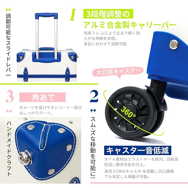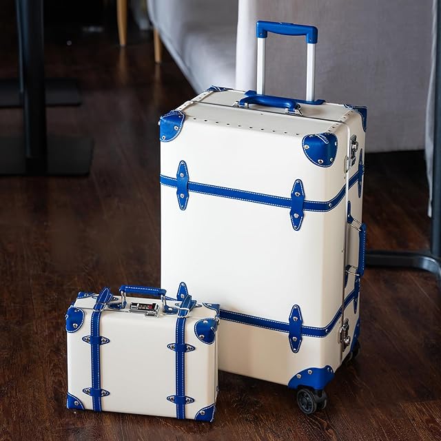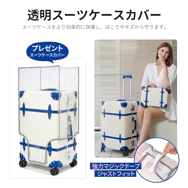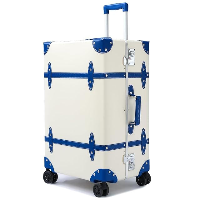 デザイン性: クラシックなトランク型スーツケースで、白地にブルーのアクセントが特徴的。高級感のある仕上がりと実用性を兼ね備えています