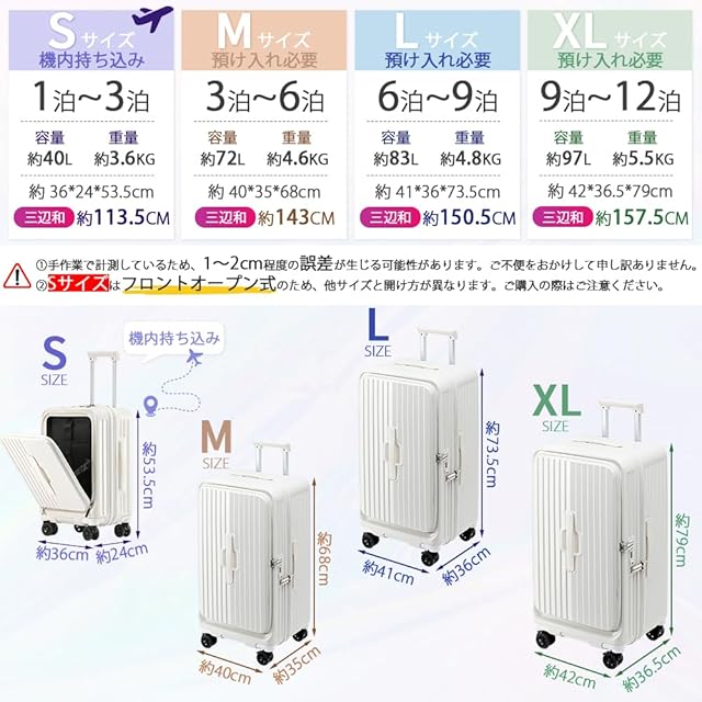 【5色4サイズ展開|1年間安心付き】お客様の旅スタイルに合わせて、全5色と4サイズ(S/M/L/XL)をご用意。航空機内持ち込み対応のS型から、長期旅行に最適なXL型まで、あらゆる旅行シーンに対応します。
