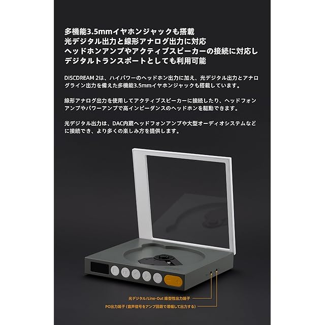 【3.5mmイヤホンジャック & 多機能3.5mmイヤホンジャック】DISCDREAM 2は、3.5mmステレオミニジャックを採用し、32Ωの負荷で2Vrms/124mWの歪みのない出力を提供します。これにより、ほとんどのカナル型やインイヤー型イヤホン、また駆動しやすいヘッドホンを容易に駆動できます。さらに、多機能3.5mmイヤホンジャックを搭載し、光デジタル出力と線形アナログ出力に対応。これにより、ヘッドホンアンプやアクティブスピーカーに接続し、デジタルトランスポートとしても使用可能です。線形アナログ出力を介してアクティブスピーカーに接続したり、ヘッドホンアンプやパワーアンプを使って高インピーダンスのヘッドホンを駆動できます。光デジタル出力は、DAC内蔵ヘッドホンアンプや大型オーディオシステムへの接続が可能で、多彩な楽しみ方を提供します。