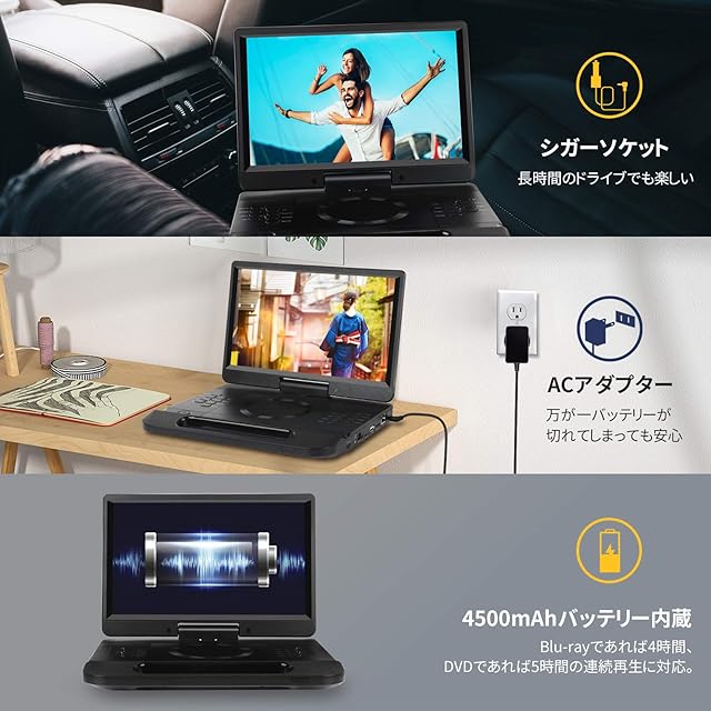 ✅【3電源対応・5時間連続再生・レジューム機能】変換プラグACアダプター、12Vカーアダプター、4500mAh充電バッテリーにも対応しています。1台に複数の変換プラグを搭載したモデルなので、場所を選ばず外出先でもブルーレイの美しい映像を楽しめます。4500mAhバッテリー内蔵、BD連続再生時間4.5時間、DVD連続再生時間5時間の長時間連続再生が可能。レジューム機能を搭載しており、視聴中に電源を切ったり、ディスクを取り出しても、次回再生時には前回止めたところから再開できるので、とても便利です(ご注意:レジューム機能を有効にするには、電源を切る前にディスクカバーを開ける必要があります!)。子供がお気に入りのアニメヤ映画をポータブルブルーレイプレーヤーで見せておけば車内ではぐっすり。