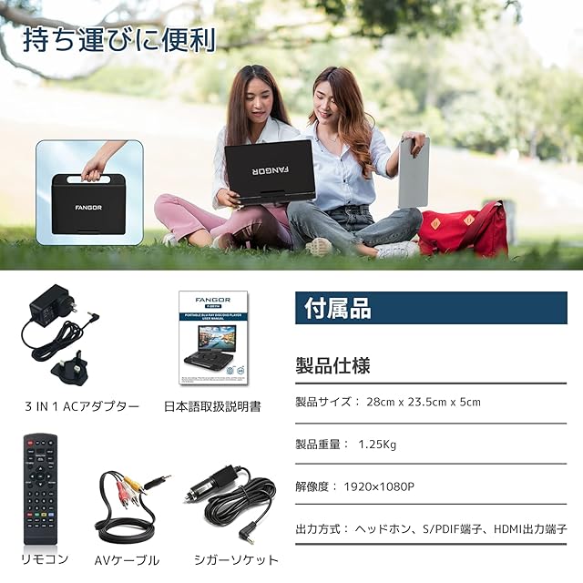 商品名:FANGOR ポータブルブルーレイプレーヤー 12インチ 1080P液晶 270度回転 4500mAh内蔵バッテリー 5時間連続再生 CPRMとリージョンフリー対応 HDMI出力 AV入力 イヤホンジャック出力 USB対応 3電源対応 車載可能 携帯便利 日本語取扱説明書付き 適格請求書発行可
