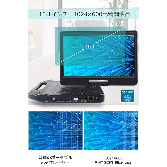 商品名:FANGOR ポータブルブルーレイプレーヤー 12.5型 10.1インチ 回転式画面 hdmi出力 CPRM イヤホンジャック入力/AV入出力 3電源対応 説明書付き