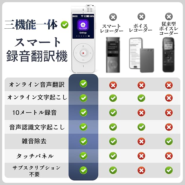 多機能、サブスクリプション不要:この多機能ボイスレコーダー&翻訳機は、録音、文字起こし、翻訳機能を1つにまとめ、録音精度は最大98%に向上しました。Wi-Fiまたはホットスポットに接続すれば、標準録音、音声録音、録音ファイルのアップロード、文字起こし、インスタント音声翻訳機能を利用できます。また、6言語の無料録音、無制限の音声テキスト変換機能、134言語のインスタント音声翻訳機能もサポートしています。サブスクリプション不要、時間制限なし!