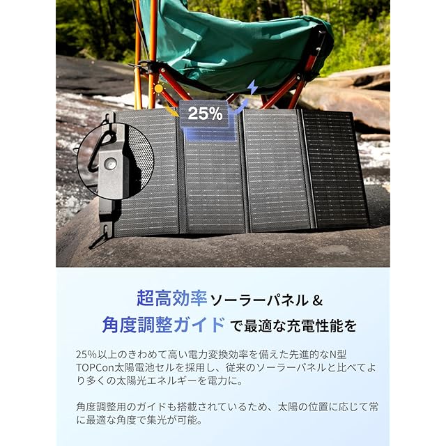 【25%の超高効率ソーラー発電】電力変換損失の少ないソーラーパネルと集光を最適化する角度調整用ガイド搭載で高効率のソーラー発電を実現。