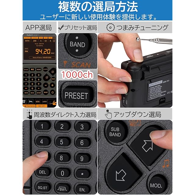 商品名:ZHIWHIS 高性能マルチバンドラジオ エアバンド受信機 FM/AM/SW/AIR/UHF/VHF 懐中電灯/SOSアラーム/ラジオ録音/APPコントロール/Bluetooth/MicroSDカード対応/タイマー/USB-C充電式/技適取得済 防災アウトドア 2025新登場ZWS-757