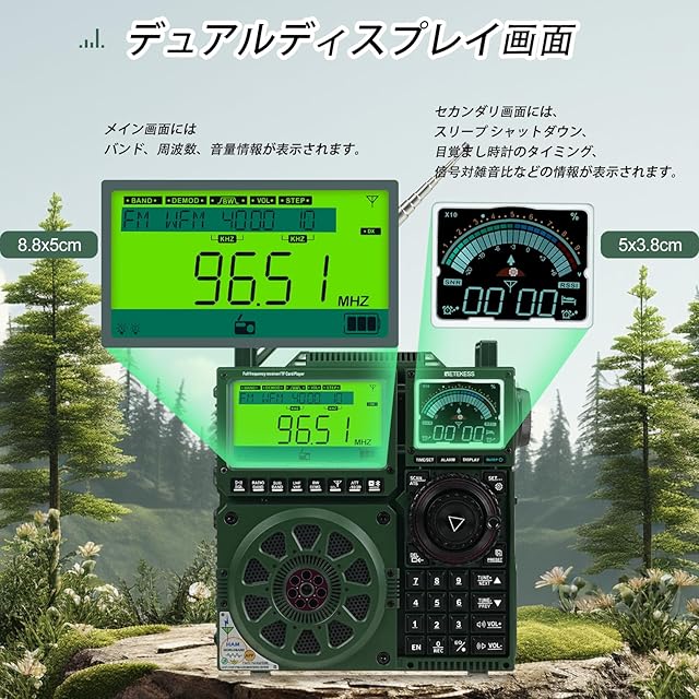 【デュアルディスプレイ画面-目覚まし時計・タイマー機能】ラジオのメイン画面にはバンド、周波数、音量情報が表示されます。セカンダリ画面には、スリープ シャットダウン、目覚まし時計のタイミング、信号対雑音比などの情報が表示されます。画面を切り替えることなく、さまざまな情報に簡単にアクセスできます。また、タイマーオンとアラームを設定することができます。