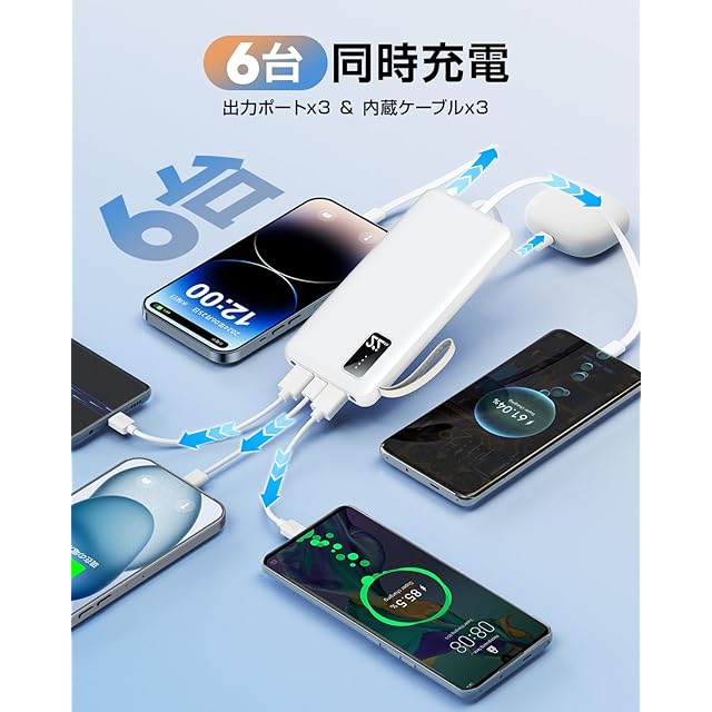 【4つ内蔵ケーブルで全機種対応・急速充電】この モバイルバッテリー ケーブル内蔵 はライトニングケーブル、Type-Cケーブル、Micro USBケーブルが内蔵されており、 モバイルバッテリー iphone アンドロイドなど、どんなデバイスに対しても追加のケーブルを持ち運ぶ必要がありません。 スマホ充電器 の2.4Aの高出力で迅速かつ効率的にデバイスを充電し、時間を無駄にしません。
